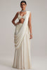 A draped skirt set with mirror and pearl embroidery, paired with a heavily embroidered blouse. The skirt and dupatta are adorned with delicate pearl drop tassels.