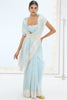 The Blake Saree in ice blue is handwoven in pure organza silk and features the silver Kadhwa border. Lightweight and fluid, this drapess beautifully and feels soft on the skin.