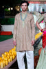 Dry henna kurta embroidered all over with resham & leather work paired with ivory dhoti.