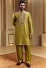 Dry henna kurta embroidered all over with kanch ka kaam paired with pants.