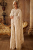 This organza saree features intricate embroidery in thread, pearl and sequin in half linear half floral pattern. The saree has an exaggerated fringe. The elbow sleeves blouse has a round neckline with tassel detail.