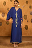 A striking sapphire-colored kaftan, showcasing a tribal whisper print at the center and a flattering V-neckline. The look is framed with a shimmer fish foil border, adding a touch of luminous detail to its bold design.