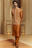 Classic hand embroidered Dori work bundi paired with raw silk sarso colour kurta and off white churidar.