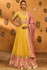 This crushed spiced ochre lehenga is adorned with littl song pot motifs and a pink patch featuring a lunar crown foil print, finished with gota detailing. It comes with an attached cancan for volume and a side zipper for ease of wear. The chanderi blouse showcases jacquard patchwork and intricate embroidery details, adding texture and richness. Completing the look is a pink organza dupatta with soft crushing and foil borders, bringing a light, festive shimmer to the ensemble.