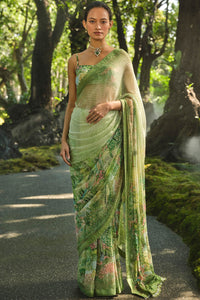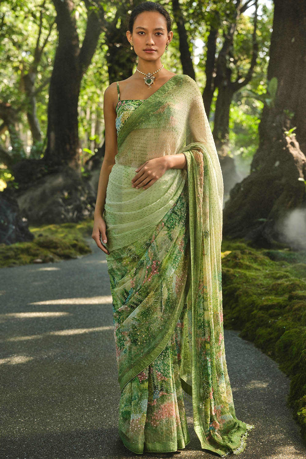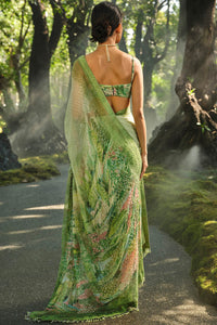 Bringing to life the ecosystem of the forest, this enchanting saree is crafted in breezy chiffon. With flowing rivers, growing trees, blooming flowers & refreshing greens recreated in threadwork, beads & sequins, this saree drapes you with the bounties of nature and is perfect for eventide soirees.