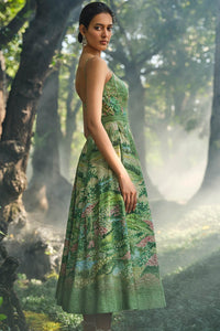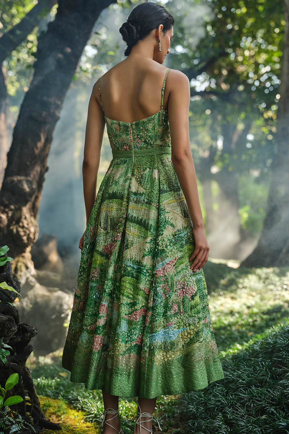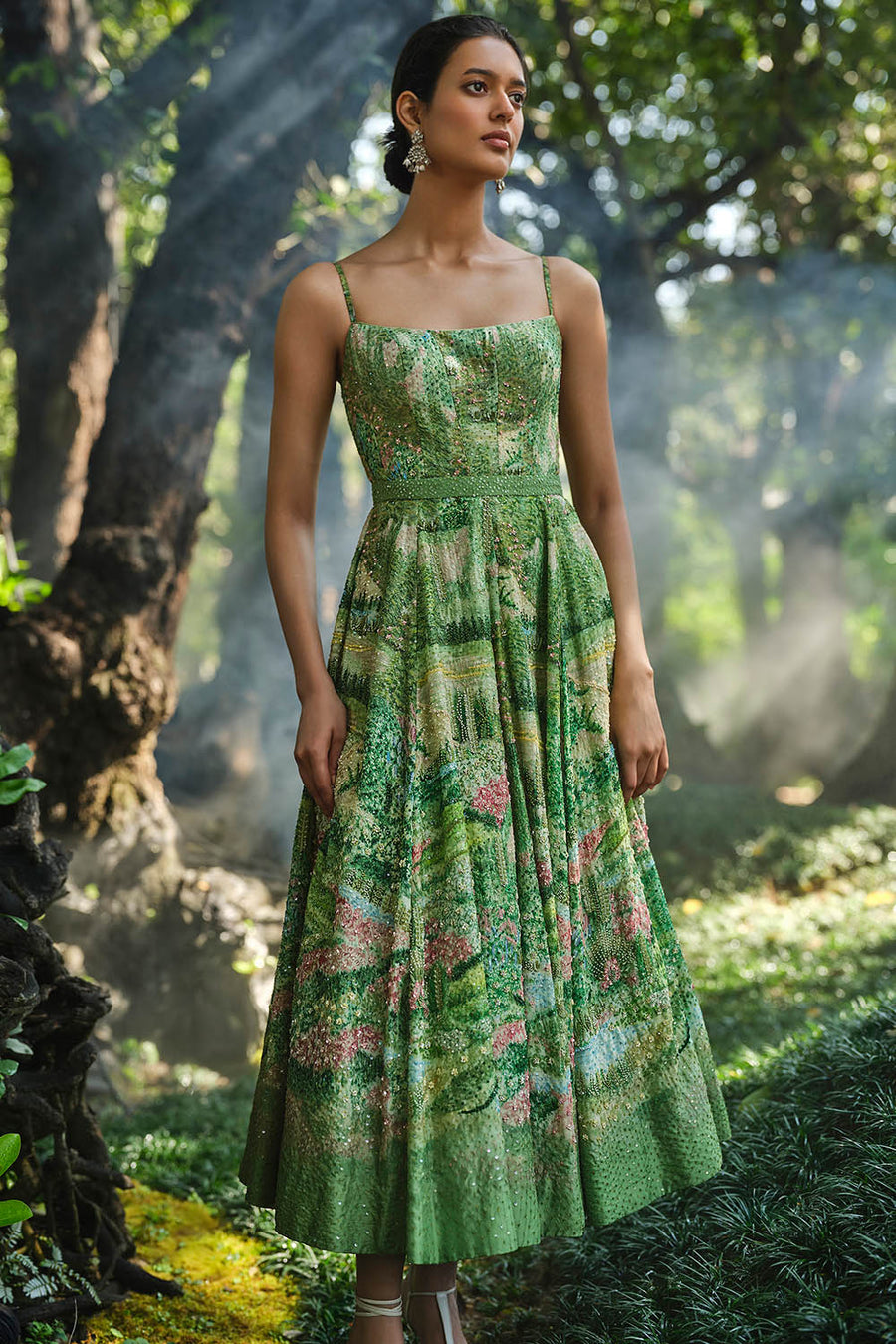 Bringing to life the ecosystem of the forest, this enchanting dress is crafted in the iconic 50s dress silhouette. With flowing rivers, growing trees, blooming flowers & refreshing greens recreated in sequins & beads, this dress in silk is perfect for that much awaited cocktail celebration.
