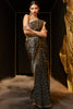 This black handwoven saree is crafted in pure silk using the Cutwork Emboss technique and comes laced with intricate gold detailing inspired from the Baroque era. To complete the ensemble, we recommend adding a statement belt and some gold danglers.