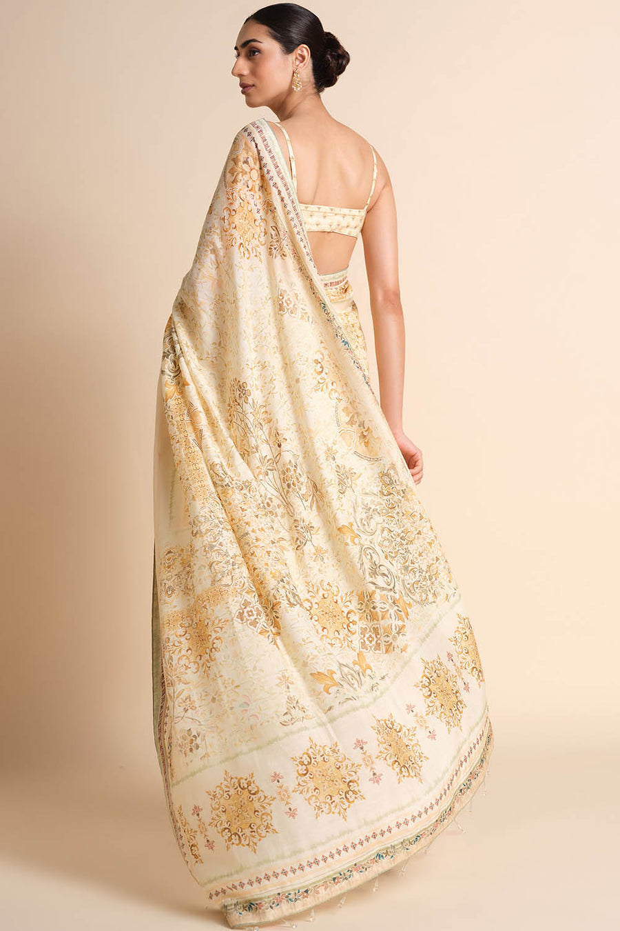 Vanora extends its timeless allure to daytime celebrations in all-over floral prints. This breezy silk saree sways with you and is effortless to drape.