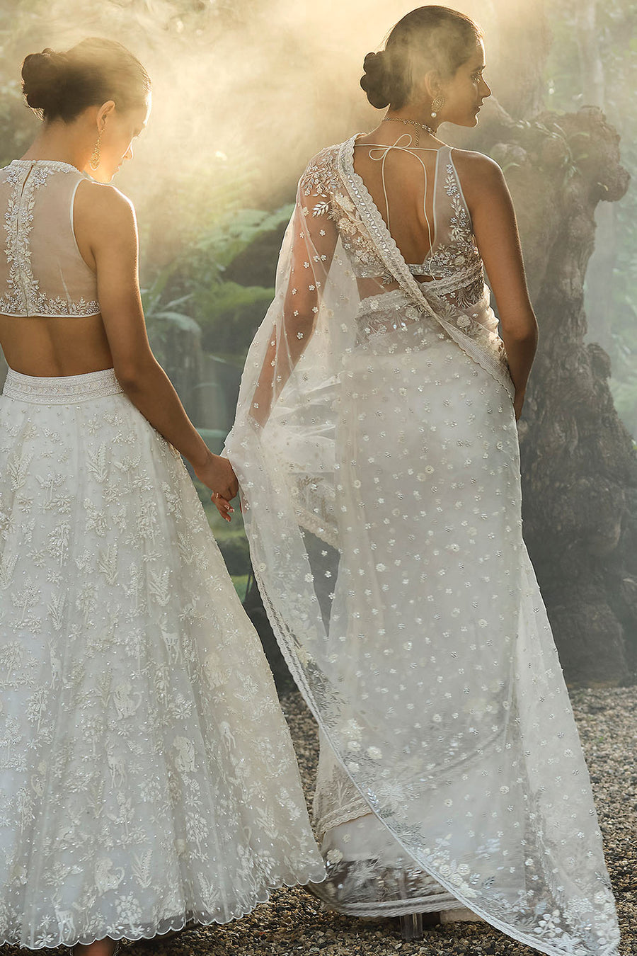 A drape that mirrors the calming ripples & rushing waters of a forest waterfall. Crafted in luxurious silk, this saree is elevated in our signature gota patti, beads & sequins, making it the perfect white drape of your dreams.