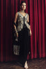 The ensemble features a slit-top blouse richly embellished with gold and silver beadwork, paired with a black saree edged in a shimmering border.